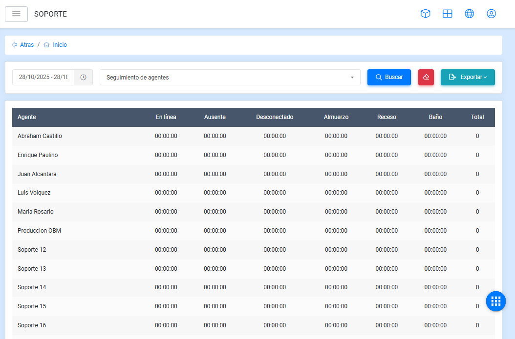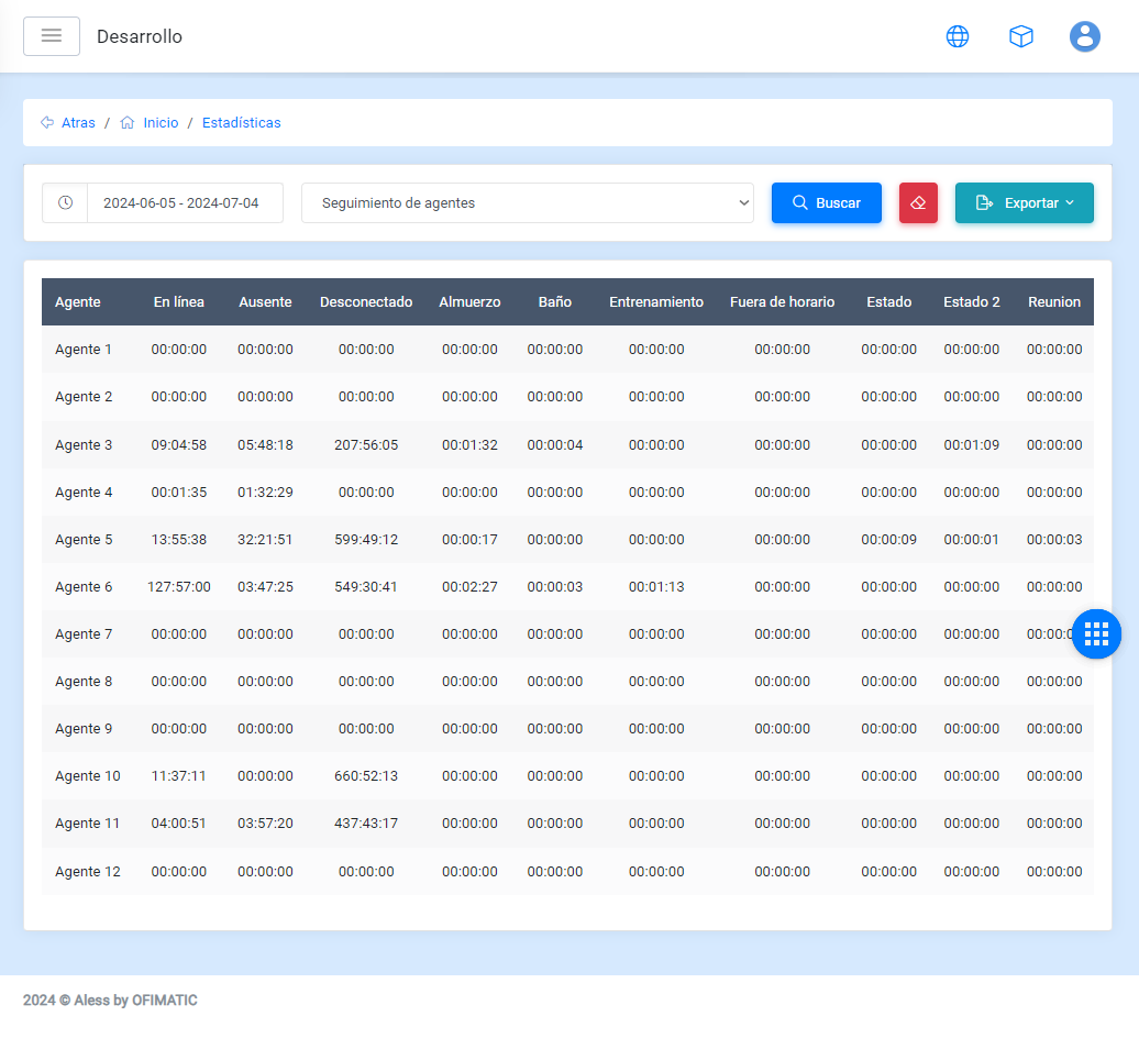 En este apartado se visualiza el seguimiento de todos los agentes que se encuentran agregados en Aless, mostrando el tiempo de conexion de cada uno de estos y cuanto han durado con cada estado.