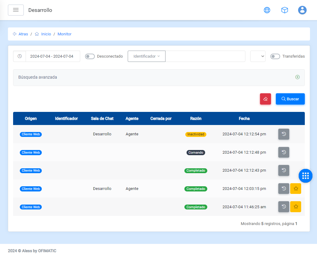 - Transferidas: Este muestra las conversaciones que fueron transferidas.