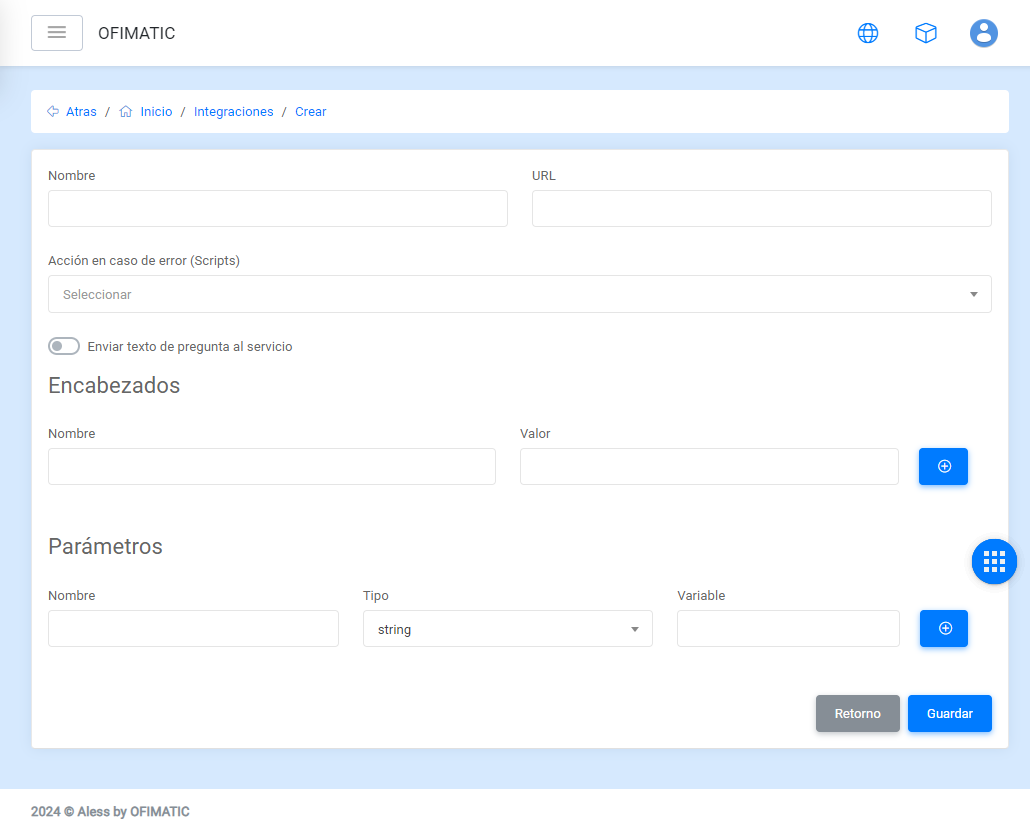 En este apartado podrá crear y modificar las integraciones a través de un formulario en el que debe completar los siguientes campos: