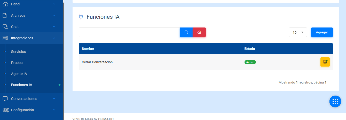 En este apartado podrá crear y modificar las funciones que el Agente IA podra acceder y usar en una conversación, a traves de estas se podran usar las integraciones a servicios de teceros ya previamente configuradas en la seccion de servios o integraciones.