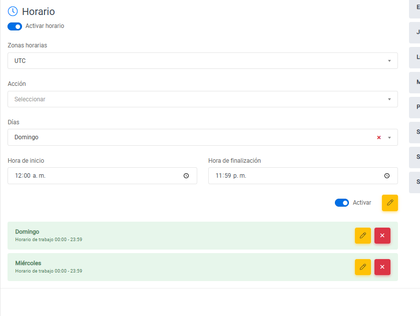 - Activar: Este indica si el día seleccionado esta activo o no.