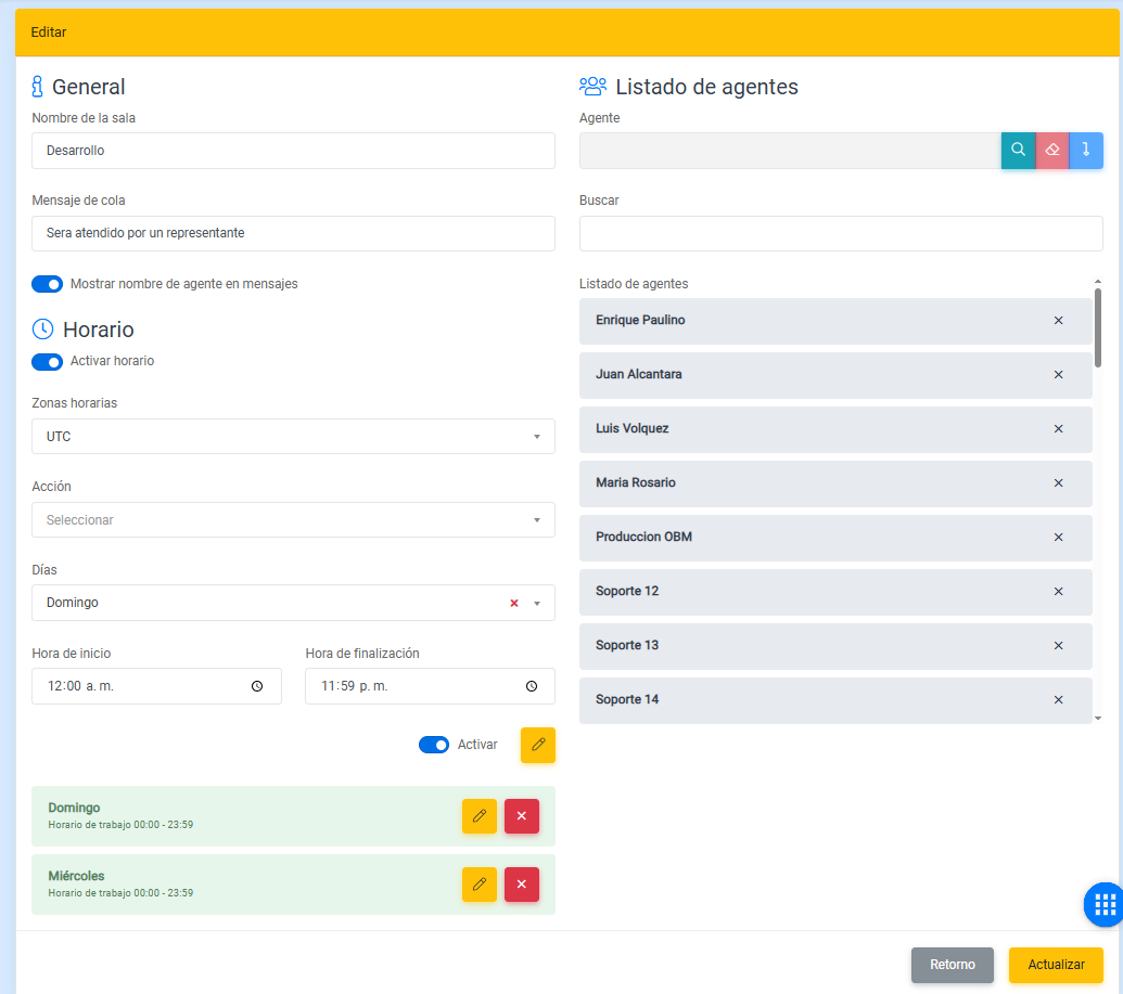 - Activar horario: Este indica si el horario del chatroom estará activo.